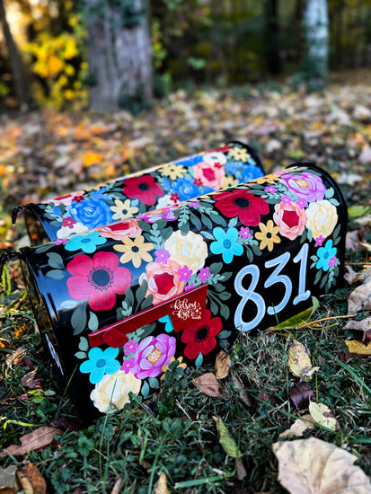 These mailboxes come in black or white and can be personalized with names, house numbers, and a floral design. If requested, I can also add the house number to the front of the mailbox. Some customers choose to leave numbers off the front in case they move later, using removable number stickers or adding house numbers to their post instead. *If you choose no numbers painted on the mailbox, make sure to have numbers somewhere on the post to ensure mail delivery. ****IF YOU DON’T WANT ANY WORDING OR NUMBERS ON THE SIDES AND/OR WANT FLORAL ALL OVER THE SIDES, THIS WILL BE AN ADDITIONAL FEE, AS PAINTING FLORALS ALL OVER THE ENTIRE MAILBOX TAKES A LOT MORE TIME AND PAINT. IF YOU WANT FLORALS ON THE LID AND/OR BACK, THIS IS ALSO GOING TO BE EXTRA AND WILL ONLY BE ABLE TO DO A SMALL AMOUNT ON THE ****ELITE LARGE AND JUMBO MAILBOXES ONLY**** There is not enough space to paint florals on the front lid or back of the standard size mailboxes and will not be offered. I can only paint numbers on the lids for the standard size.
