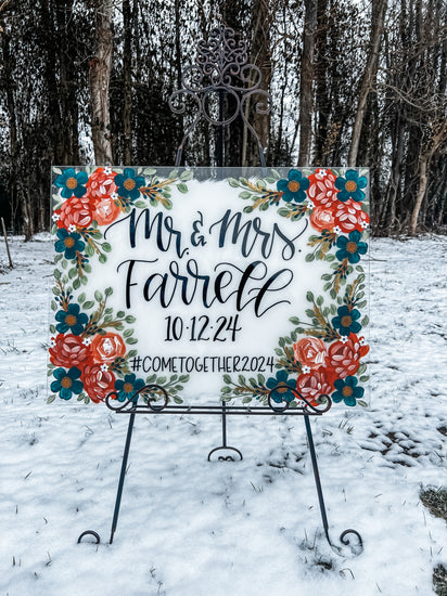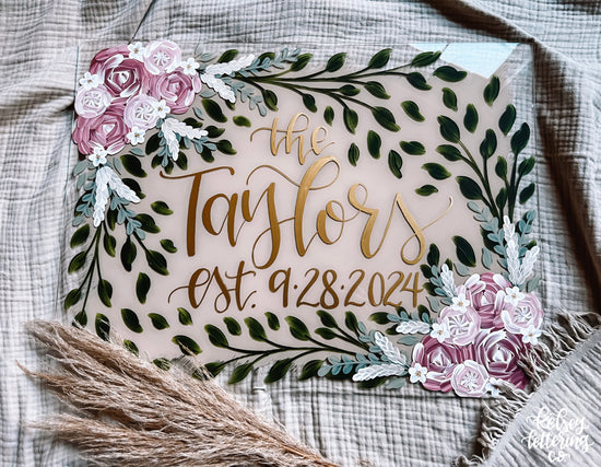 ** You will be given the option at checkout to personalize your item. Please provide the names, dates, or what wording you would like on the sign. Please provide floral colors and any other special instructions. ** I do my own hand lettered script and print. If you want specific words printed or scripted, please let me know, otherwise I will use my artistic discretion. If you need to send photos of wedding colors, send me a message on social media or email kelseyletteringco@gmail.com and I will do my best to color match, but nothing can ever be exact! Please specify if you want a background color or clear.