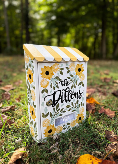 These mailboxes come in black or white and can be personalized with a last name, house numbers, and a floral design. I can paint floral design on the top or striped to coordinate with floral colors or color requested. **If you do not want a house number on the mailbox, please make sure you have the number displayed on your home to ensure mail delivery.